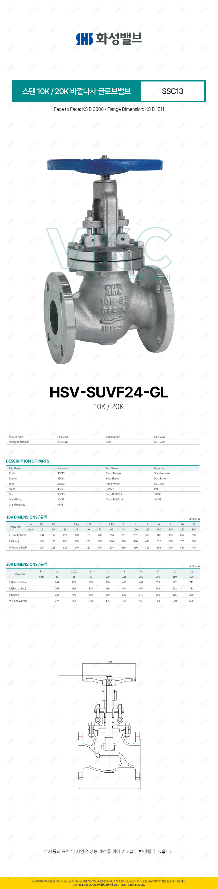 1000002203 (국산) 화성밸브 스텐 플랜지식 글로브밸브 10K 15A~500A OS&Y BB타입 (HS SSC13 OSY B.B 스텐글로브 0.5인치~20인치)