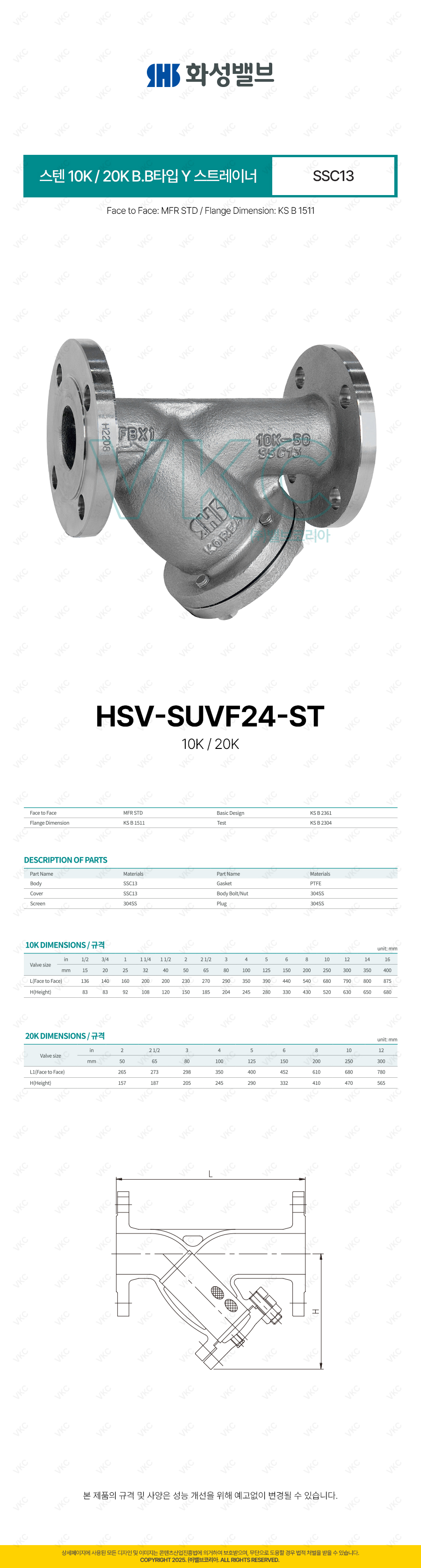 1000002209 (국산) 화성밸브 스텐 플랜지식 스트레이너 10K 15A~100A BB타입 (HS SSC13 B.B 스텐스트레나 0.5인치~4인치)